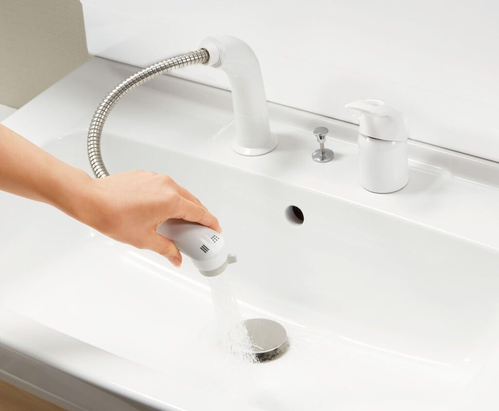 ホースを引き出して使えるので、水くみや掃除に便利です。