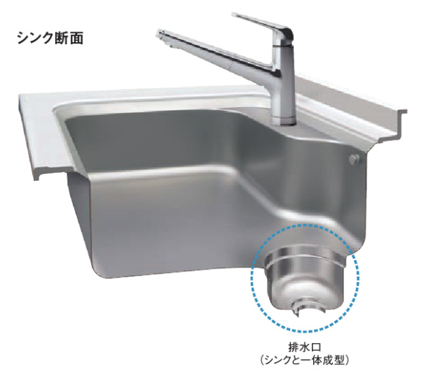 汚れが溜まりやすい排水口もシンクと一体成型で、
